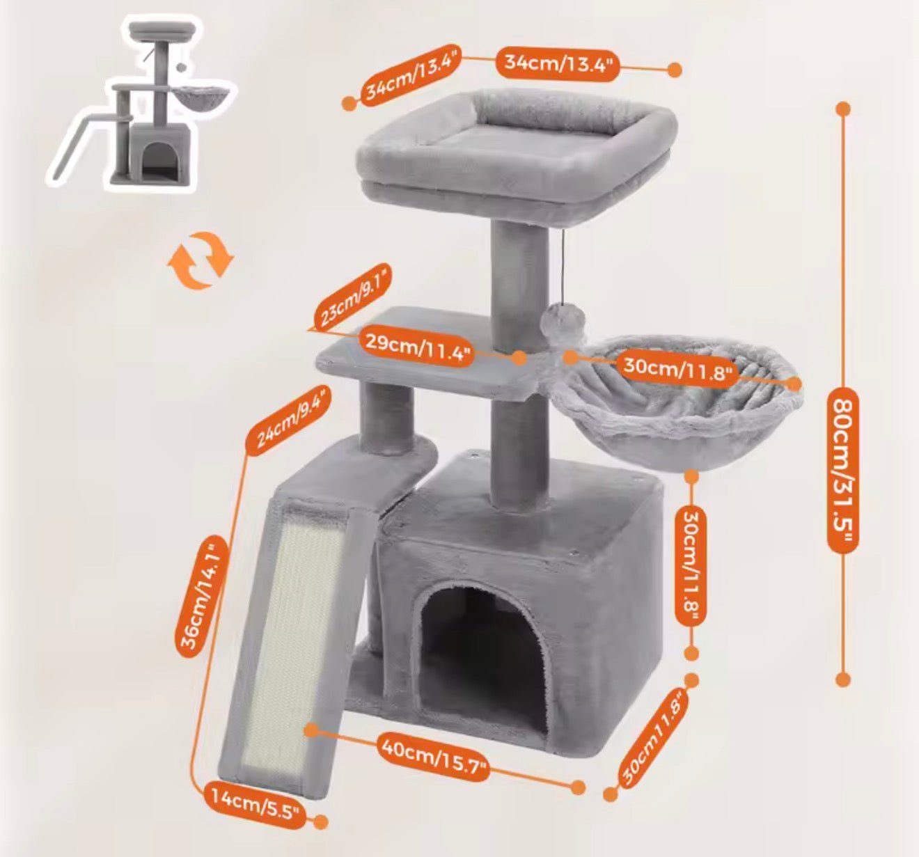 Enticing to cats. Designed to fulfil your cat's scratching instinct, come wit 2 scratch post of different heights, allowing your cats to stretch and scratch with ease. The bottom cave allows your cat to sleep and rest.Â